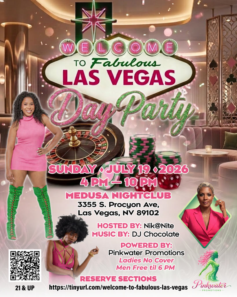 The Welcome to Fabulous Las Vegas Day Party is set for Sunday, July 19, 2026, from 4 PM to 10 PM at Medusa Nightclub, located at 3355 S. Procyon Avenue in Las Vegas. Hosted by Las Vegas resident and AKA member Nik@Nite, with music by DJ Chocolate, the event is powered by Pinkwater Promotions—also owned by a sorority sister out of Houston, Texas. The event promises a vibrant daytime Vegas experience, with complimentary entry for ladies and free admission for men before 6 PM. VIP sections will also be available for reservation. This 21-and-up event adds another exciting highlight to the weekend lineup in Las Vegas. Tickets for the Vegas event can be purchased at https://tinyurl.com/welcome-to-fabulous-las-vegas