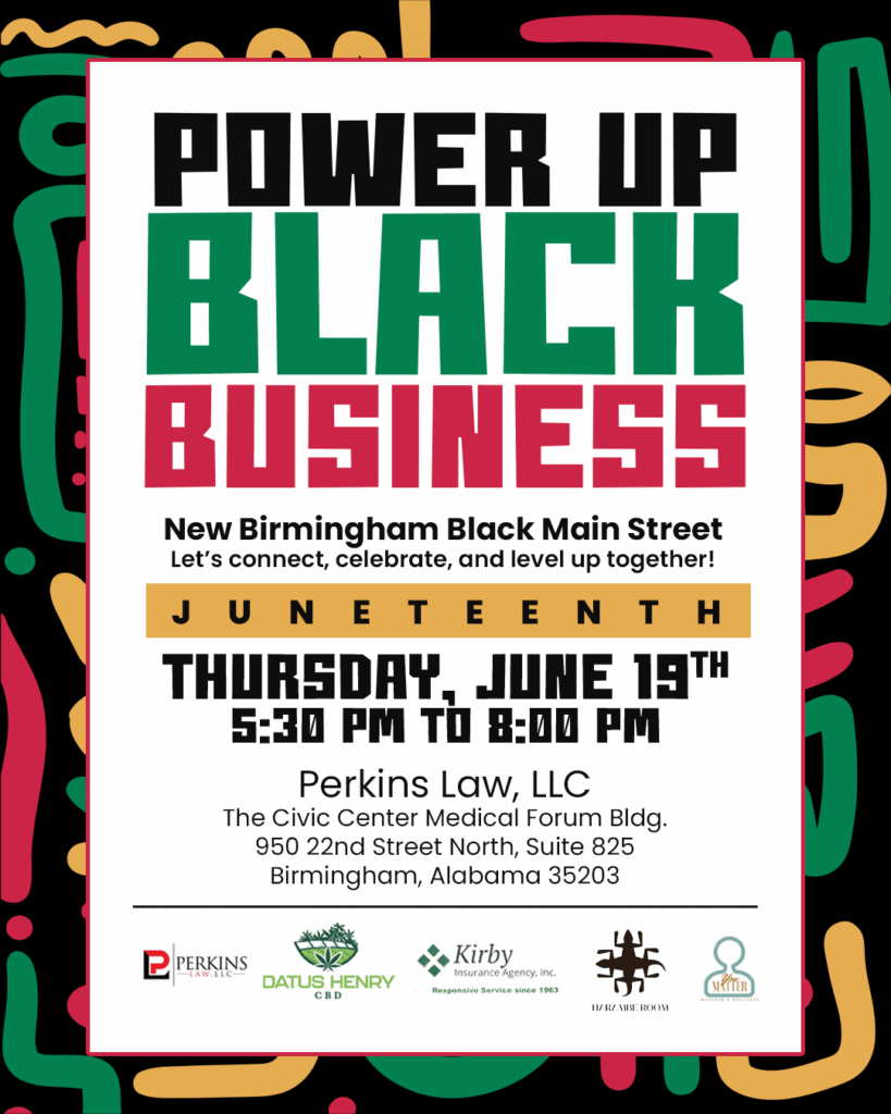 The New Birmingham Black Main Street will host it’s next event on Thursday, June 19th at Perkins Law, LLC which is located in the Civic Center Medical Forum Bldg. Join us for another great day of quality conversations and networking from 5:30pm – 8:00pm.