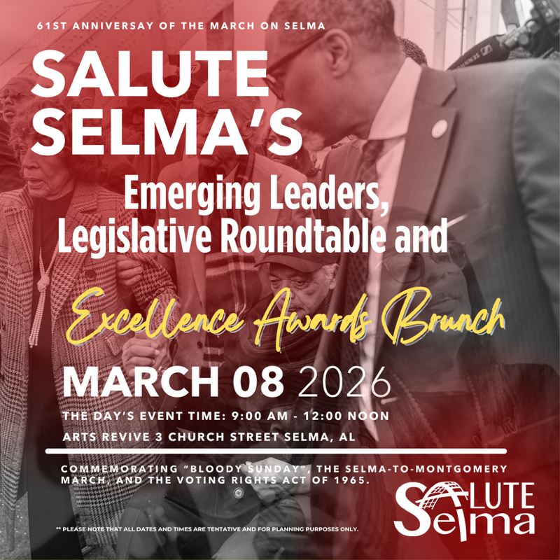 In recognition of the 61st Anniversary of the March on Selma, community leaders and changemakers will gather for Salute Selma’s Emerging Leaders, Legislative Roundtable and Excellence Awards Brunch on March 8, 2026.