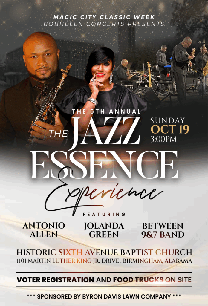 Don’t miss the Jazz Essence Experience featuring Antonio Allen, Jolanda, Green and Between 9&7 Band LIVE on Sunday, October 19th at the Historic Sixth Avenue Baptist Church located at 1101 Martin Luther King Jr. Drive, Birmingham, Alabama.  Voter registration and Food Trucks on site! Sponsored by Byron davis Lawn Company.